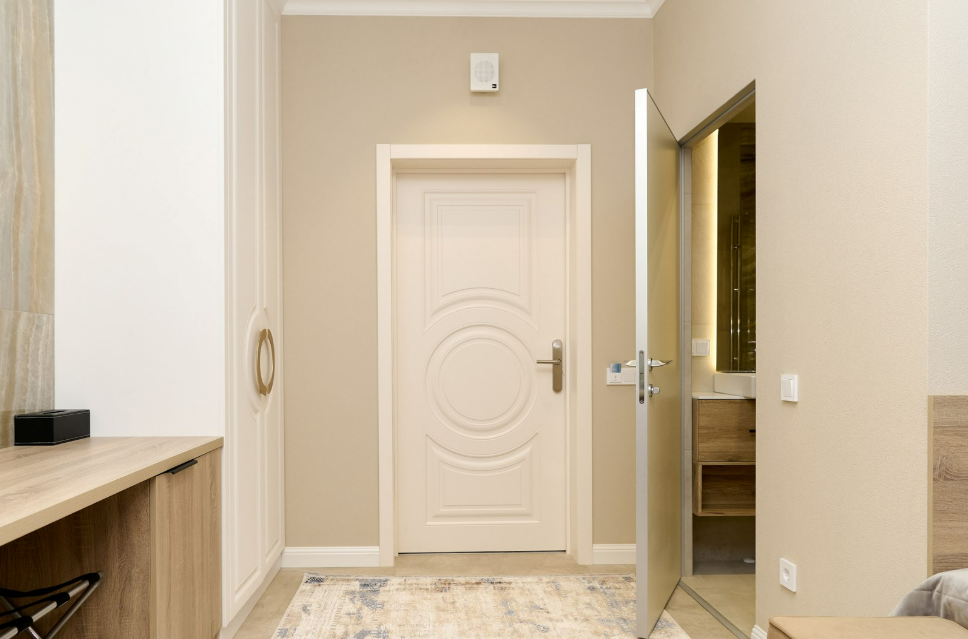 - Мебель: вешалка, зеркало, кровать двуспальная, прикроватные тумбочки, стол, стулья, шкаф